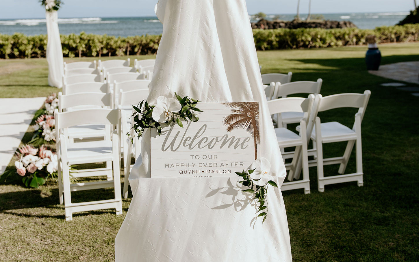 My wedding invitation and collateral materials consisted of all custom design pieces. The tri-fold invite, RSVP, menu and give-away tags used a combination of ivory shimmer paper and rose gold foiling accents to give the design an elegant yet modern feel. Various design elements like the palm tree were engraved on props and used throughout the venue.
