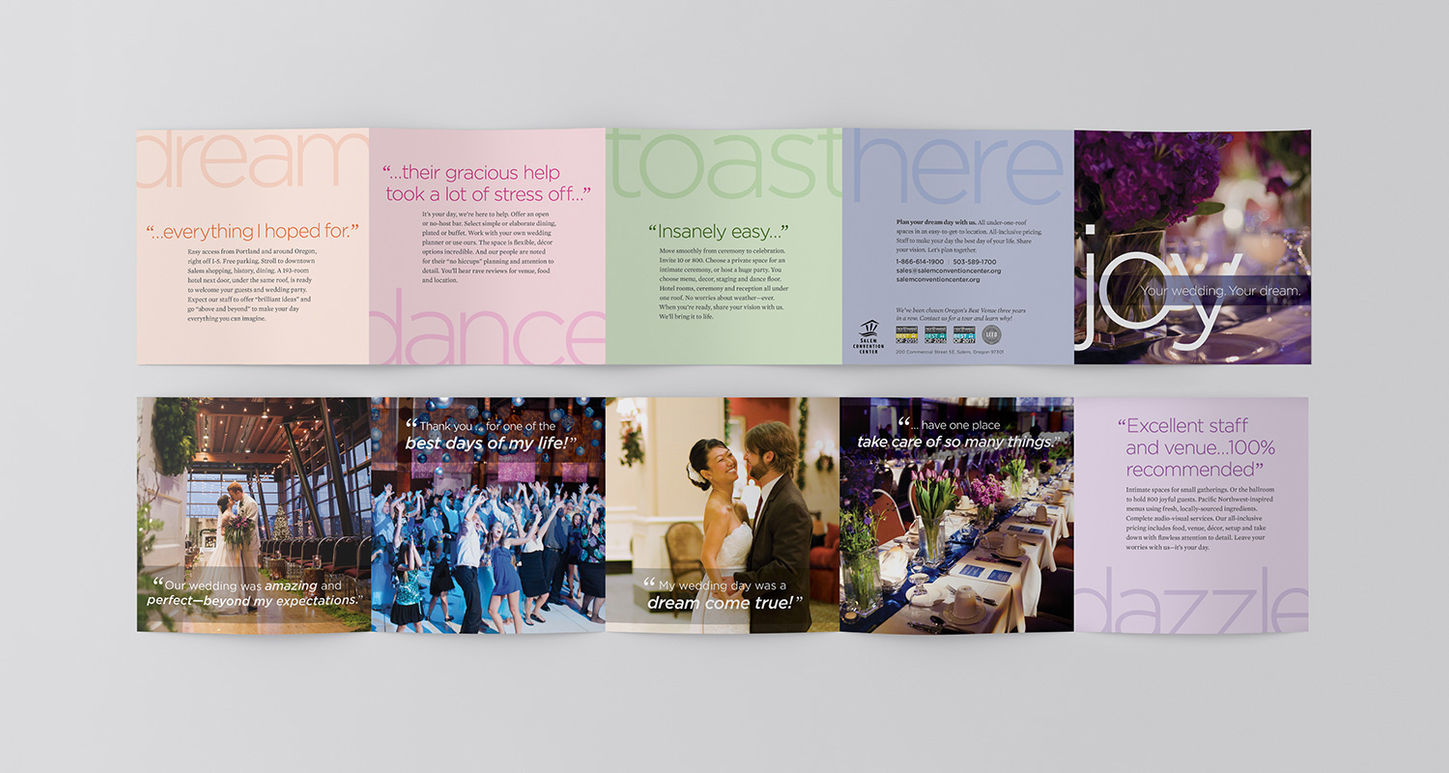 These brochures were created for Salem Convention Center to showcase their facilities as a world class venue for all types of events. One focused on the facility itself, highlighting the configurable space and award winning food, and the other on weddings with client testimonials. An additional interactive version of the facility brochure was also created.